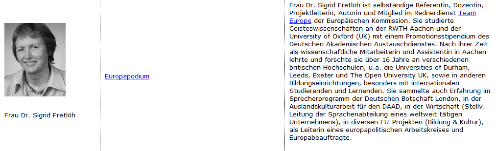 7 Jahre Sprecherprogramm zu wirtschaftlichen, kulturellen und politischen Deutschland- und Europa-Themen, z.B. “EU-enlargement and the single currency – a German view“, “The future of the European Union – how do Germans see it?“, “Current Developments in Europe“ |